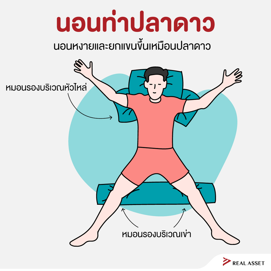 นอนท่าปลาดาว : ในวันที่เหนื่อย ๆ เชื่อว่าหลายคนคงเคยนอนแผ่บนที่นอนกันมาบ้าง บอกเลยว่าท่านี้เป็นท่าที่เป็นมิตรกับกระดูกในร่างกายเรามาก ๆ เวลานอนท่าปลาดาว ให้คุณหาหมอนมารองไว้บริเวณเข่าและหัวไหล่ดู ท่านี้จะทำให้กระดูกสันหลัง คอ ไหล่ อยู่ในตำแหน่งที่ถูกต้อง ไม่ทำให้เกิดแรงกดทับที่จุดใดจุดหนึ่ง