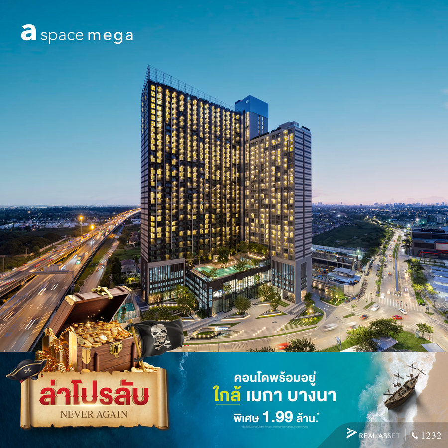 - โครงการ A Space Mega (เอ สเปซ เมกา) คอนโดฯ พร้อมอยู่ใกล้ เมกา บางนา แวดล้อมไปด้วยสิ่งอำนวยความสะดวก กับ Facilities จัดเต็มพื้นที่ส่วนกลางครอบคลุมกว่า 5 ชั้น สระว่ายน้ำ INFINITY EDGE POOL พร้อมสูดโอโซนพื้นที่สีเขียวกว่า 4,000 ตารางเมตร ออกแบบในสไตล์ FUTURISTIC MODERN DESIGN ใช้เส้นสายที่สะท้อนถึงคนยุคใหม่ ถ่ายทอดความเป็น URBAN LIFESTYLE ได้อย่างลงตัว ให้ความรู้สึกถึงความตื่นตัวไม่หยุดนิ่งอยู่ตลอดเวลา พิเศษราคา 1.99 ล้านบาท*