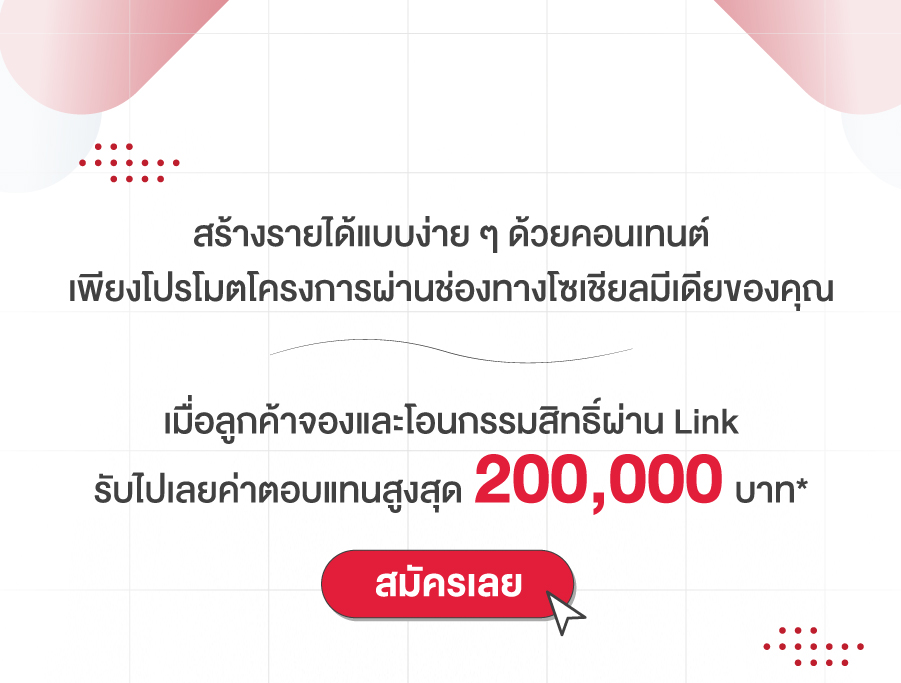เมื่อลูกค้าจองและโอนกรรมสิทธิ์ผ่านลิงค์ >> https://forms.gle/e7cmo6NmfACkUGSQA รับไปเลยค่าตอบแทนสูงสุด 200,000 บาท*