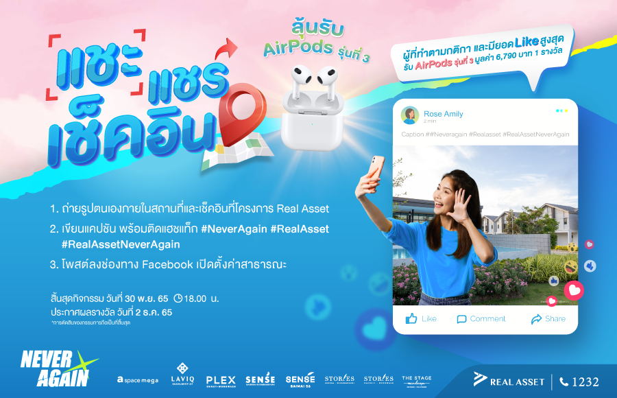 REAL ASSET ชวนร่วมกิจกรรม “แชะ แชร์ เช็คอิน” เพียงถ่ายภาพภายในโครงการ พร้อมติดแฮชแท็ก ก็มีสิทธิ์ลุ้นรับ AirPods รุ่นที่ 3