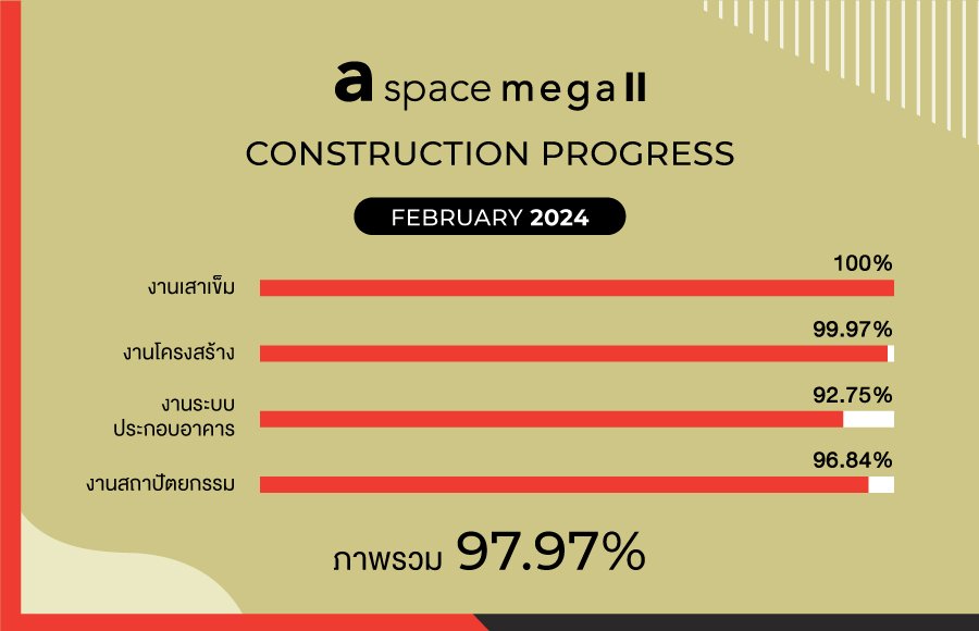 อัพเดทความคืบหน้าการก่อสร้างคอนโดมิเนียม โครงการ เอ สเปซ เมกา 2 ประจำเดือนกุมภาพันธ์ 2567 - งานเสาเข็ม 100% - งานโครงสร้าง 99.97% - งานระบบประกอบอาคาร 92.75% - งานสถาปัตยกรรม 96.84% โดยภาพรวมทั้งโครงการ อยู่ที่ 97.97%