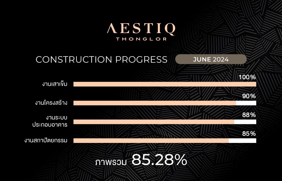 อัพเดทความคืบหน้าการก่อสร้างคอนโดมิเนียม โครงการ เอสทีค ทองหล่อ ประจำเดือนมิถุนายน 2567 - งานเสาเข็ม 100% - งานโครงสร้าง 90% - งานระบบประกอบอาคาร 88% - งานสถาปัตยกรรม 85% โดยภาพรวมทั้งโครงการ อยู่ที่ 85.28%
