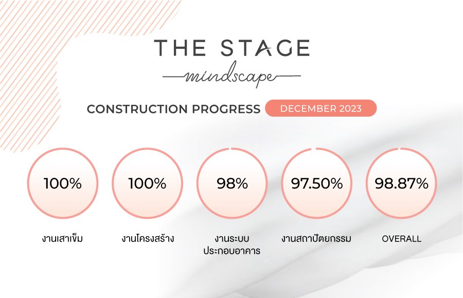 อัพเดทความคืบหน้าการก่อสร้างคอนโดมิเนียม โครงการ เดอะ สเตจ มายด์สเคป รัชดา - ห้วยขวาง ประจำเดือนธันวาคม 2566 - งานเสาเข็ม 100% - งานโครงสร้าง 100% - งานระบบประกอบอาคาร 98% - งานสถาปัตยกรรม 97.50% โดยภาพรวมทั้งโครงการ อยู่ที่ 98.87%