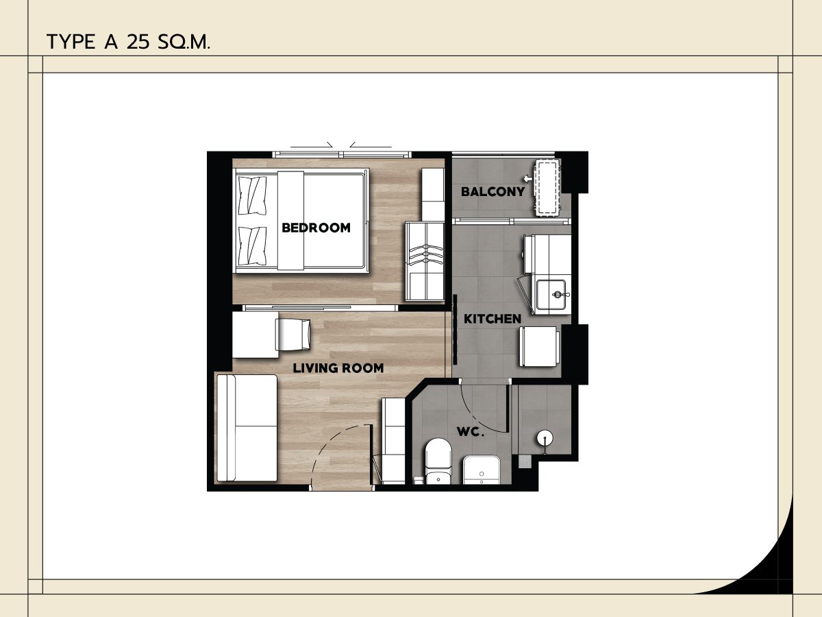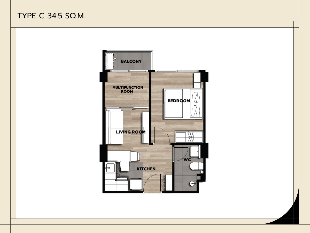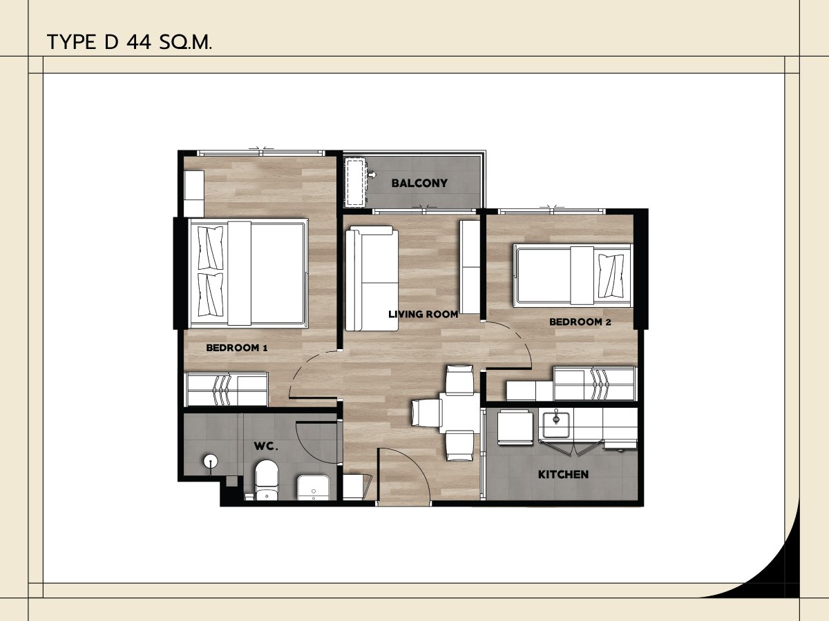 Unit Type A : 1-Bedroom 25 Sq.m. Unit Type B : 1-Bedroom 30 Sq.m. Unit Type C : 1-Bedroom Plus 34.5 Sq.m. Unit Type D : 2-Bedroom 44 Sq.m. |