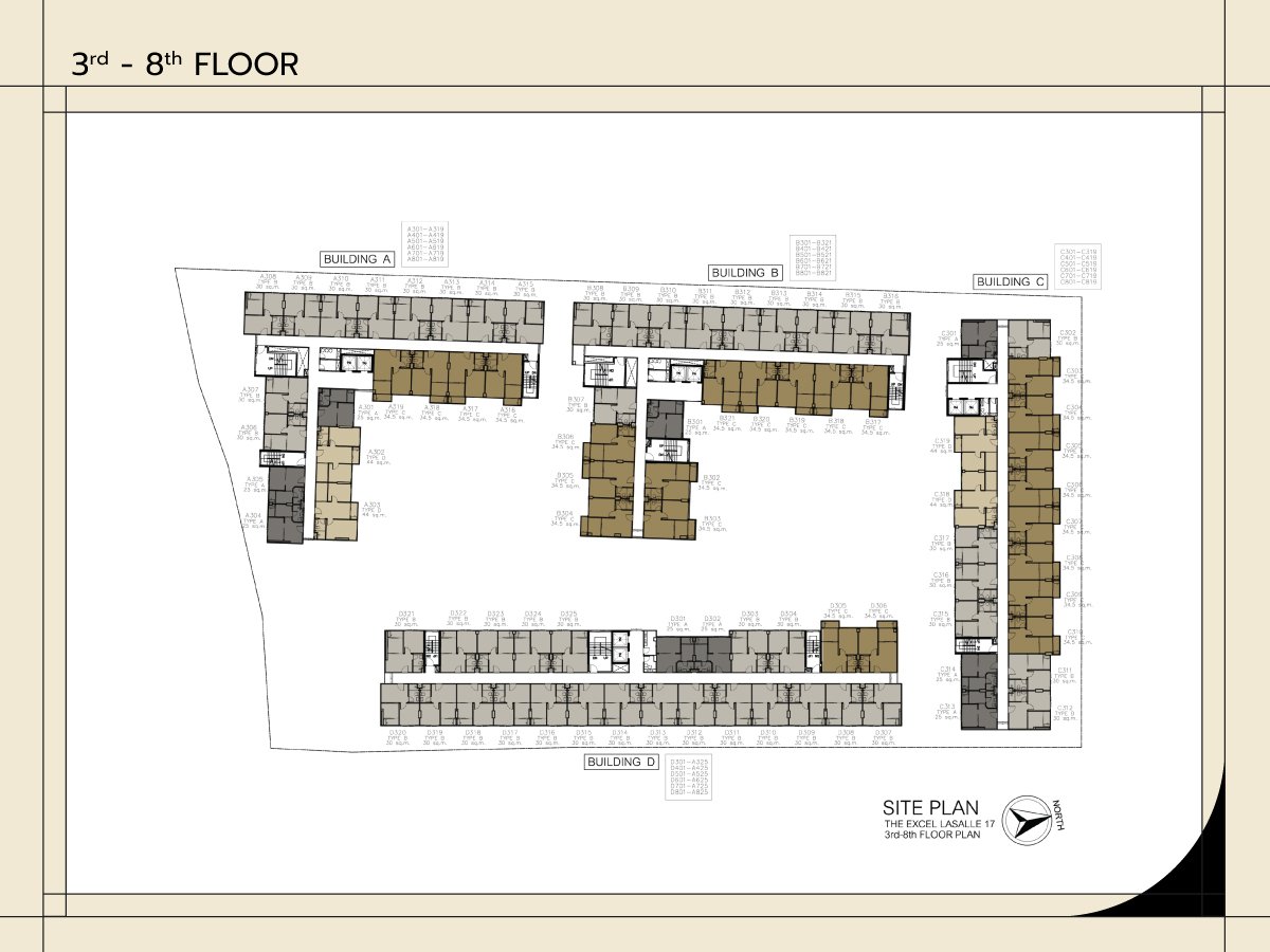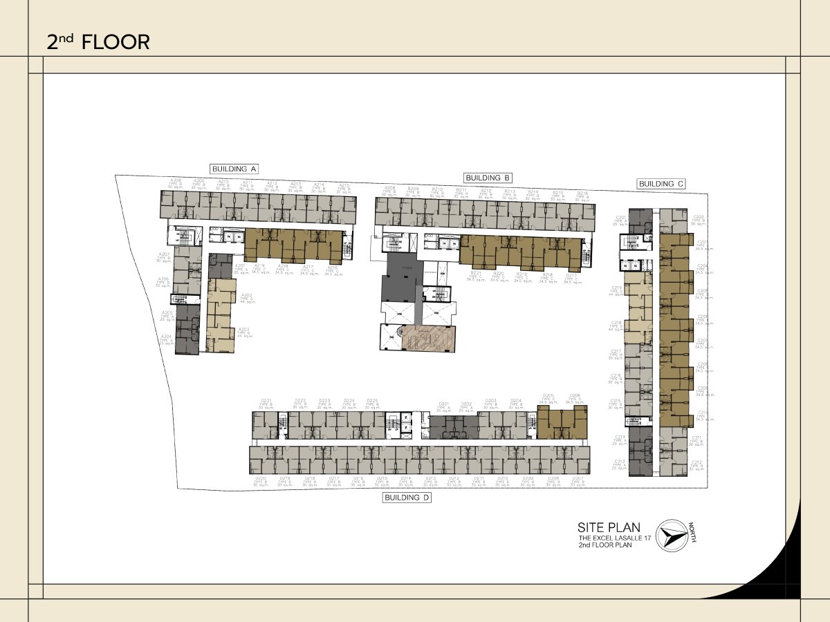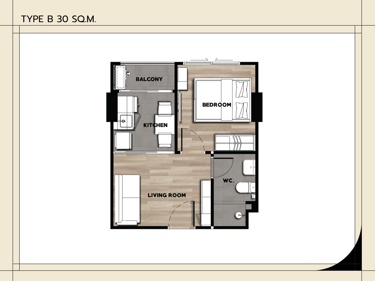 Unit Type A : 1-Bedroom 25 Sq.m. Unit Type B : 1-Bedroom 30 Sq.m. Unit Type C : 1-Bedroom Plus 34.5 Sq.m. Unit Type D : 2-Bedroom 44 Sq.m. |