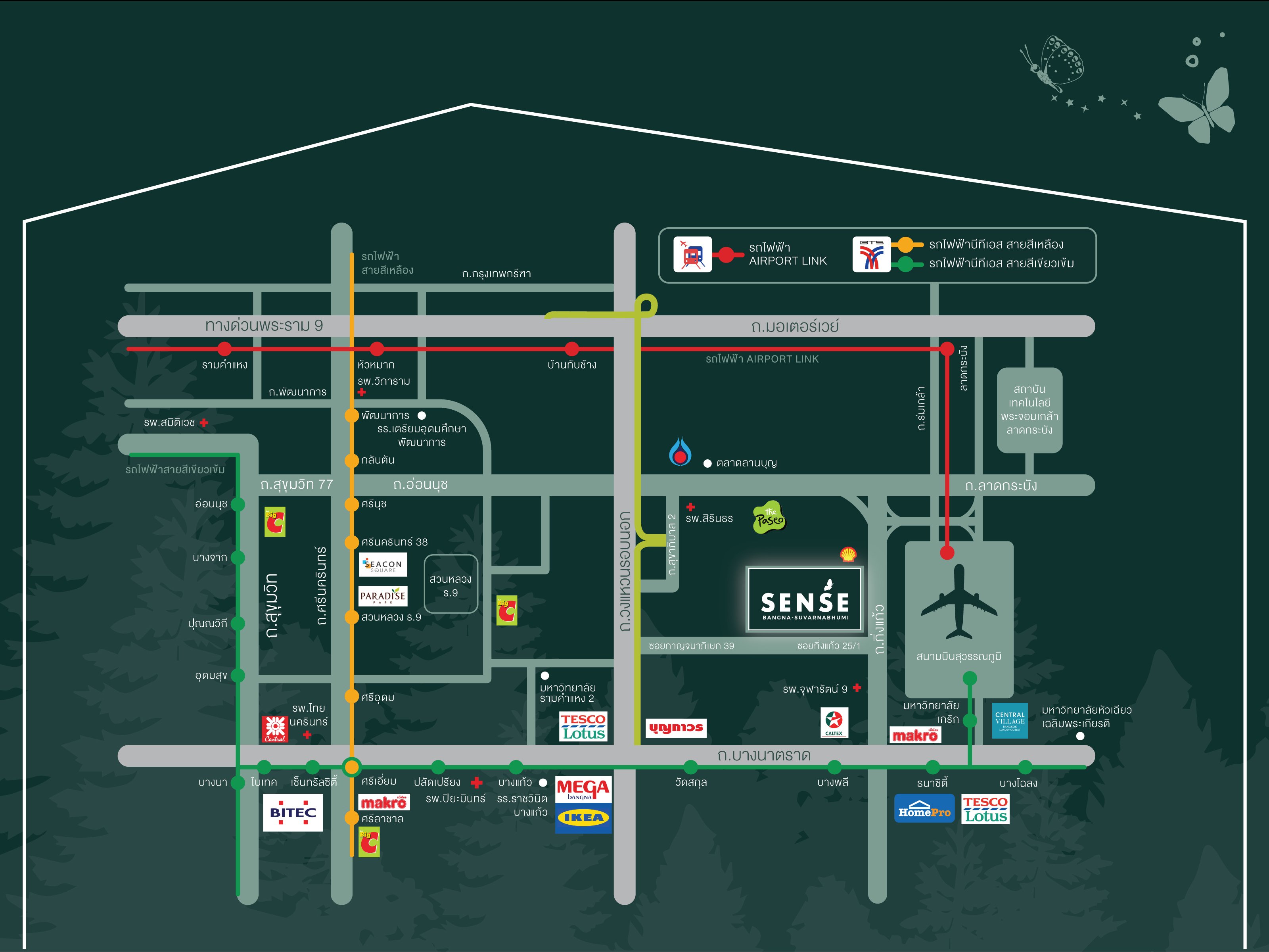 Sense Bangna-Suvarnabhumi is situated in one of the most sought-after areas of Bangna, just minutes from Suvarnabhumi Airport. Whether you're traveling internationally or exploring domestic destinations, the convenient location makes every journey effortless. Additionally, the project is well-connected to major highways, ensuring seamless access to central Bangkok and beyond.